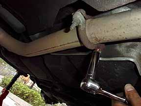 さて、マフラーは写真のセンターパイプのジョイントで繋がっているだけで、あとはゴムで吊り下がっています。