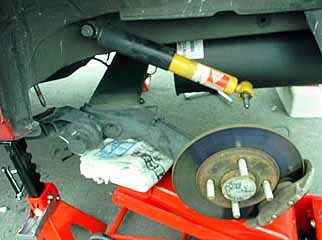 ボルト類を外すと、足廻り一式がどさっと落ちてしまい、危険でもありますのでジャッキでトーションバーを受けておきます。