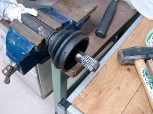 ドライブシャフトをプラスチックハンマー等で叩いて緩む場合もありますが、固い場合はシャフトを押し込む工具を使います。