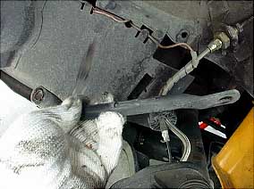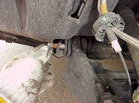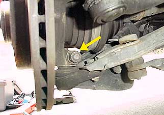 続いてロワアーム先端のボールジョイントのクランプボルトを外し、スタビライザーのジョイント部を外せばロワアームは取り外せます。