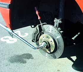 タイヤを外して、車軸が回らないようにブレーキディスクにマイナスドライバー等をさしてハブナットを緩めます。