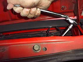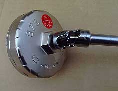 首振りラチェットハンドルにエクステンションバーをつなぎ、その先にユニバーサルジョイントを付けて、カップレンチを取り付けています。