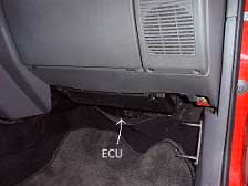 コンピュータユニット(ECU)は助手席側ダッシュボード下のヒューズボックスの奥に有ります(エアコン付きのモデル)。