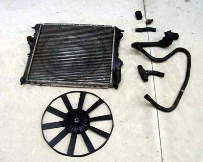 穴の開いたラジエーターと、ファンブレードも削れてバランスが悪くなっている可能性もあるので交換しました。