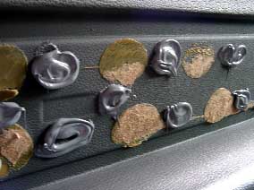 貼り付ける為接着剤を塗りますが、ドア側の古い接着剤は強力に貼り付いていて取れません、またナイフなどで削ぎ取るにもちょっと硬いのでこのままにすることにしました。