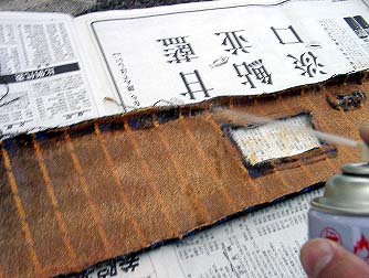 ベースの板と布の裏に均一に接着剤を吹き付けます。